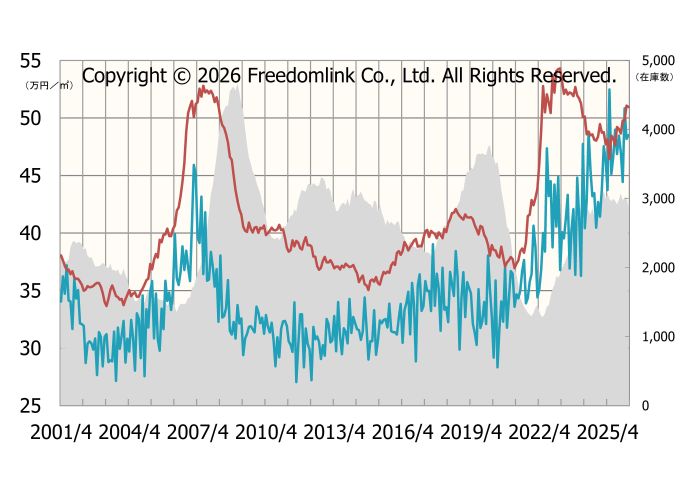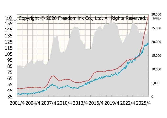 グラフ赤(折れ線):土地売出平米単価(東京)